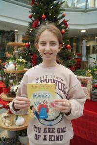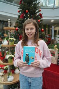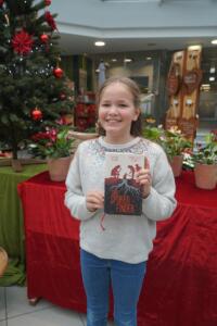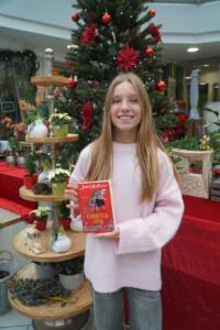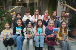 Hier sind die 1. und 2. Klassensieger des Vorlesewettbewerbs 2025 mit ihren selbst ausgewählten Büchern zu sehen: