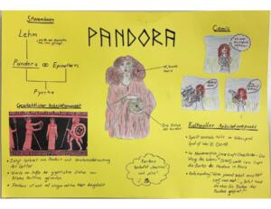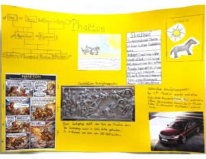 Dass die Geschichten auch in den Köpfen der Sechstklässler zum Leben erweckt worden sind, beweisen die jeweiligen Comicstrips, die auf den Referatsplakaten enthalten sind. Sie thematisieren eine wichtige Episode aus dem Leben eines antiken Helden oder Gottes. Mit dieser kreativen Umsetzung werden gleich mehrere Kompetenzen gefördert: das eigene Leseverständnis, der Blick für das Wesentliche der Heldensage, Interesse für verschiedene Raumperspektiven in den „Panels“, motorische Fähigkeiten durch das Zeichnen und sprachliches Ausdrucksvermögen durch gezieltes Einsetzen von „Think- oder Wordballoons“, „Soundwords“ oder Zusatzinformationen zu Ort und Zeit des Geschehens.